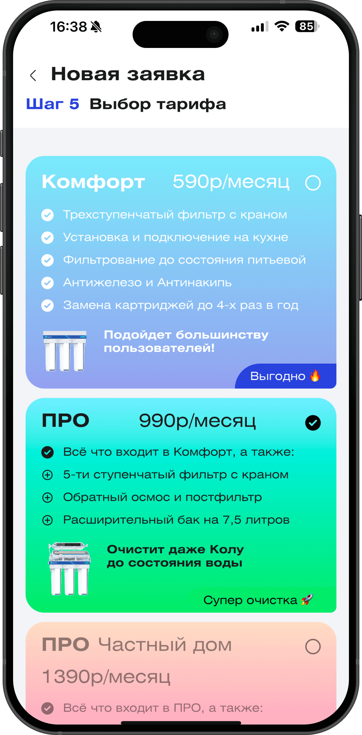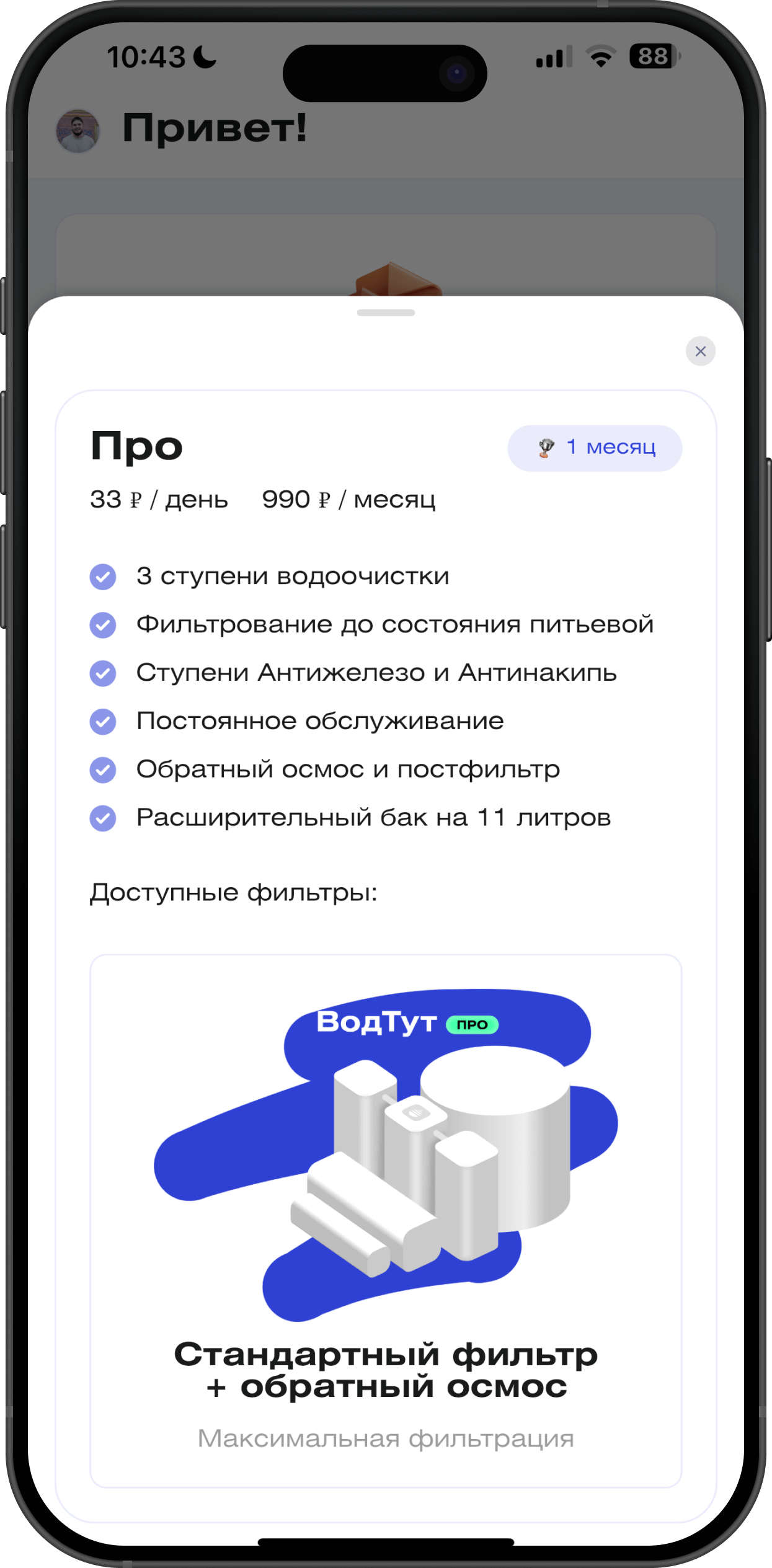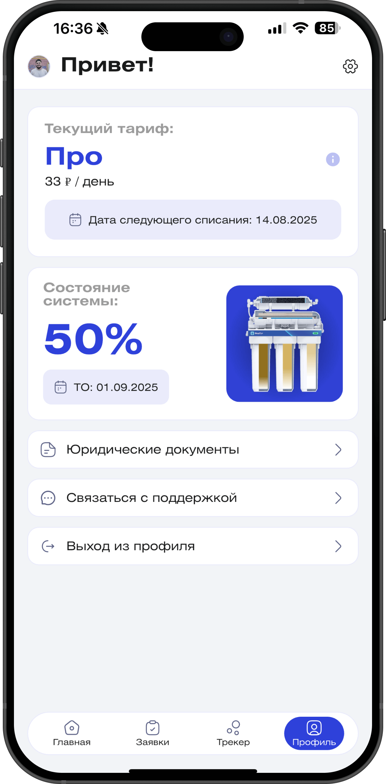 Важно: клиент должен иметь полный контроль в мобильном приложении — видеть свой тариф, статус фильтра, даты списаний и документы.